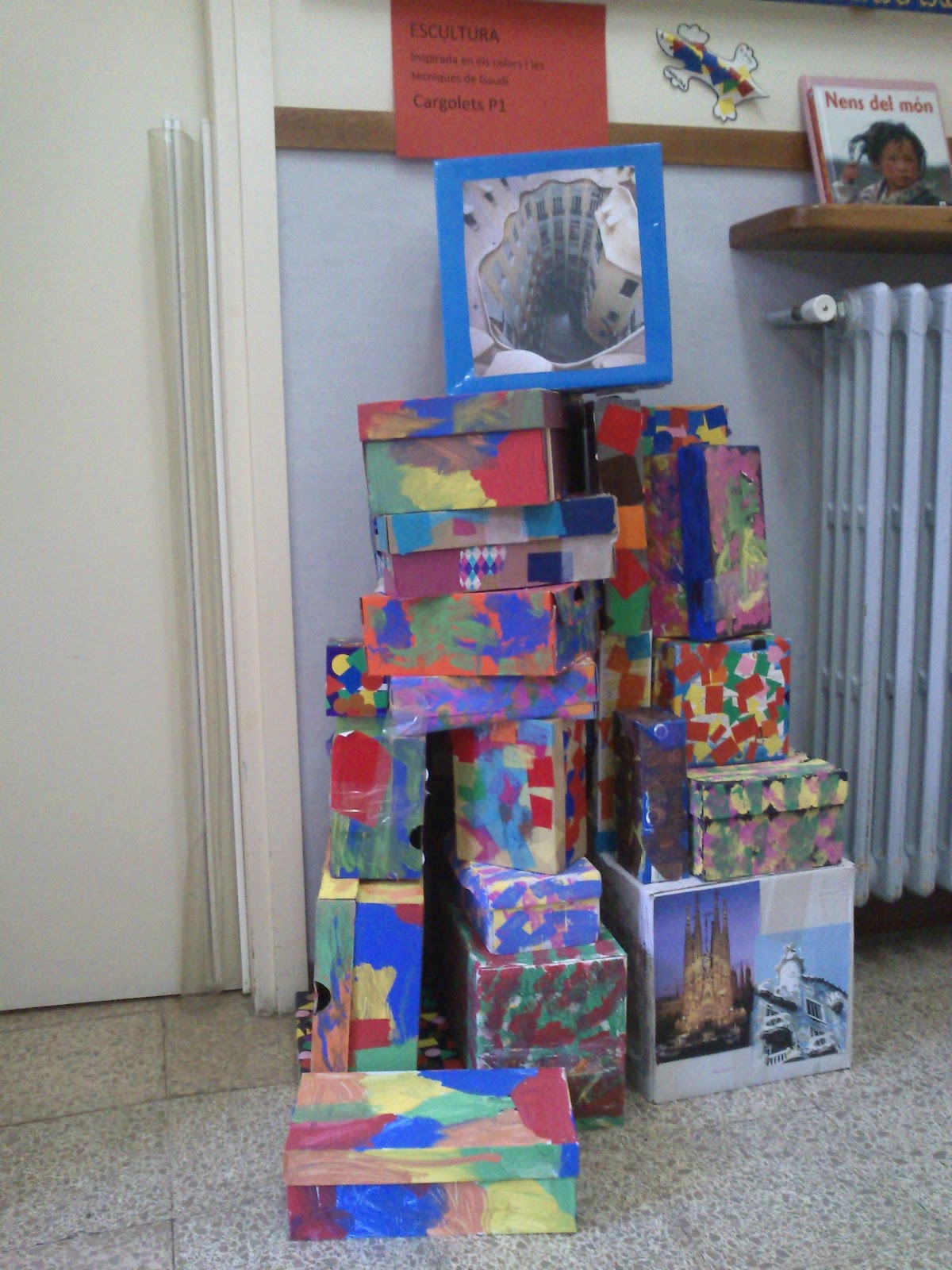 Vam demanar als pares i mares que ens portessin caixes de cartró de totes les mides i les vam anar enganxant… Ara està exposada a l’entrada de l’escola perquè els pares i mares ho puguin veure. Quins artistes!