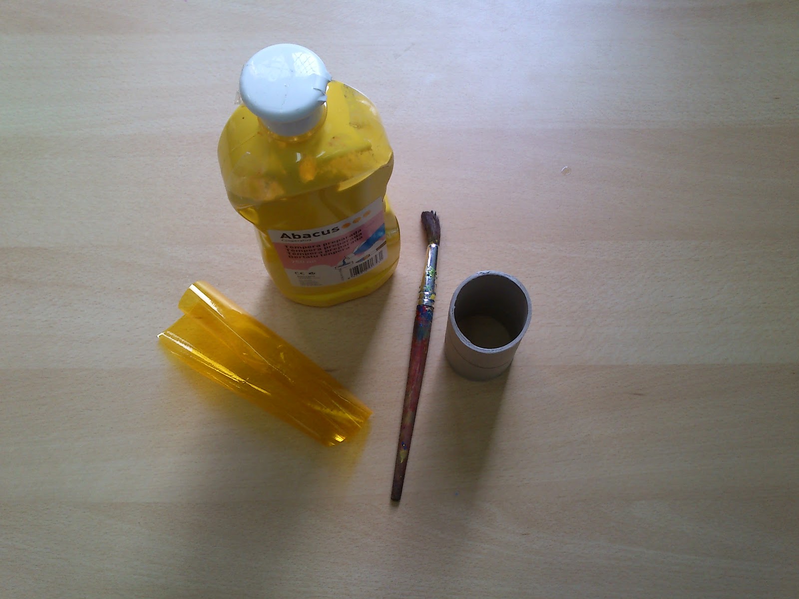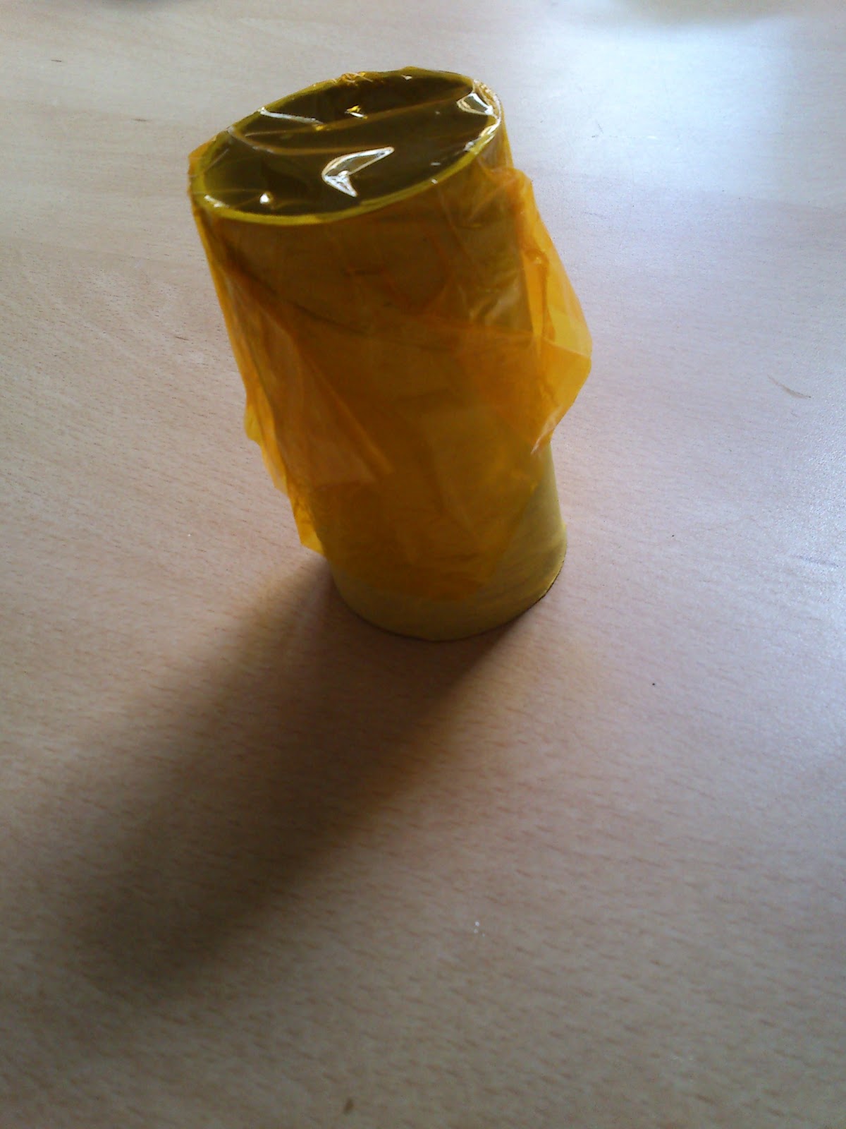 Un cop l’han pintat, deixem que s’assequi. I amb la pega enganxem un tros de paper de celofana a un dels costats, així: