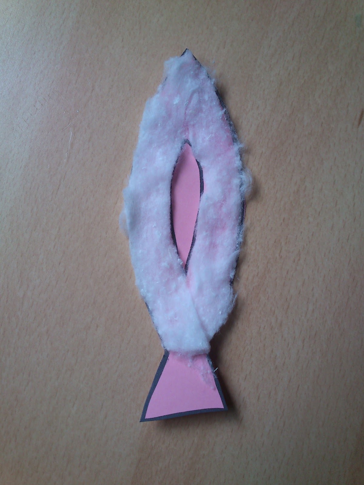 Agafem la cartolina i dibuixem unes orelles de conill. Els nens i nenes enganxen el cotó fluix pel voltant, deixant la part del mig de color rosa: