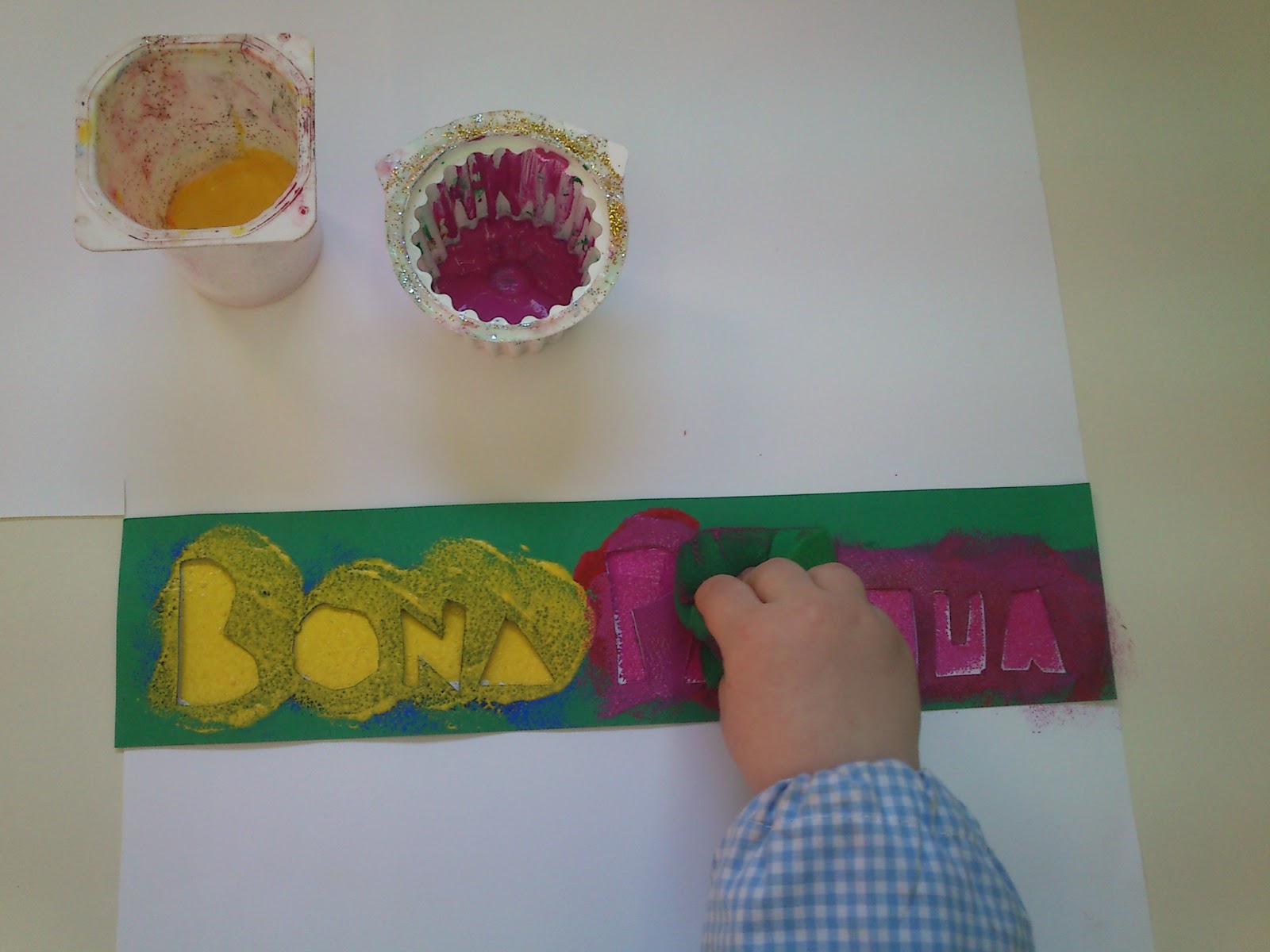 Posem aquesta cartolina al damunt d’una altra (jo l’he escollit de color blanc, però cadascú al seu gust!), amb el blutack l’enganxem una mica. El nen/a agafa l’esponja, ja suca a la pintura (l’hem d’escórrer una mica!) i poc a poc i anant amb compte va apretant-la contra cada lletra: