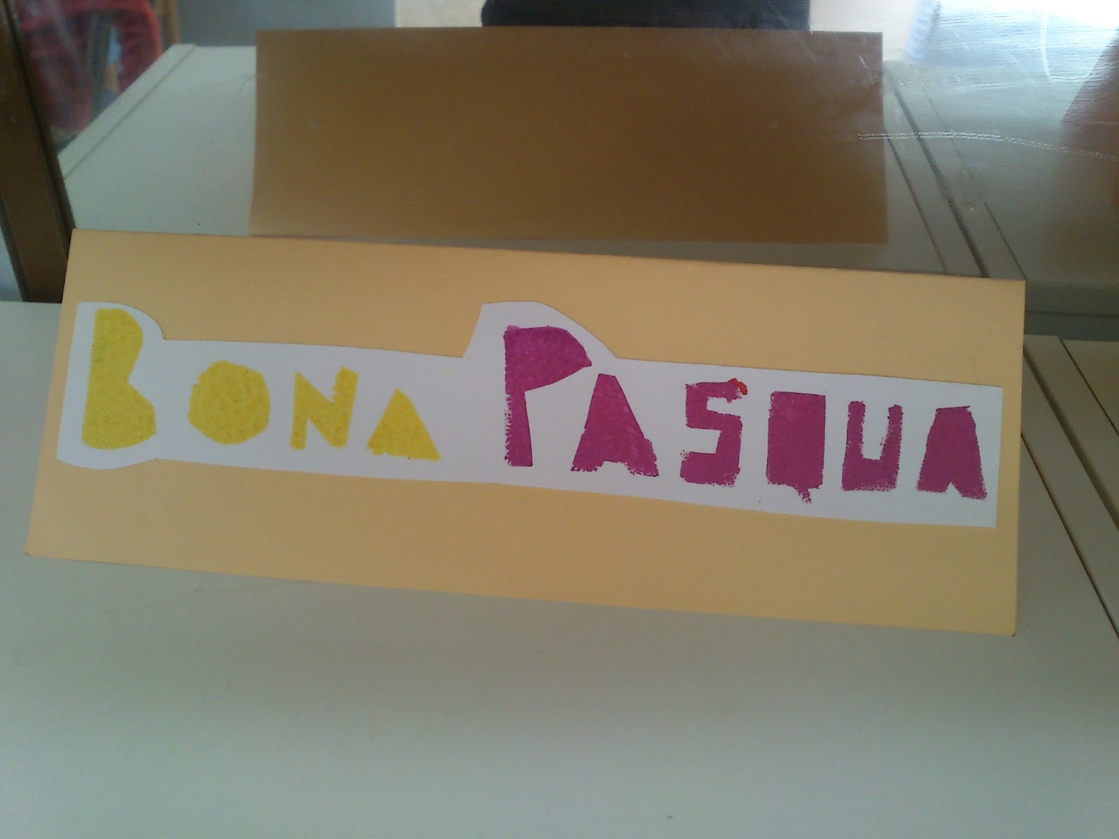 Agafem la cartolina i retallem (amb el cuter) les lletres que volem. Jo he escrit (“Bona Pasqua”):