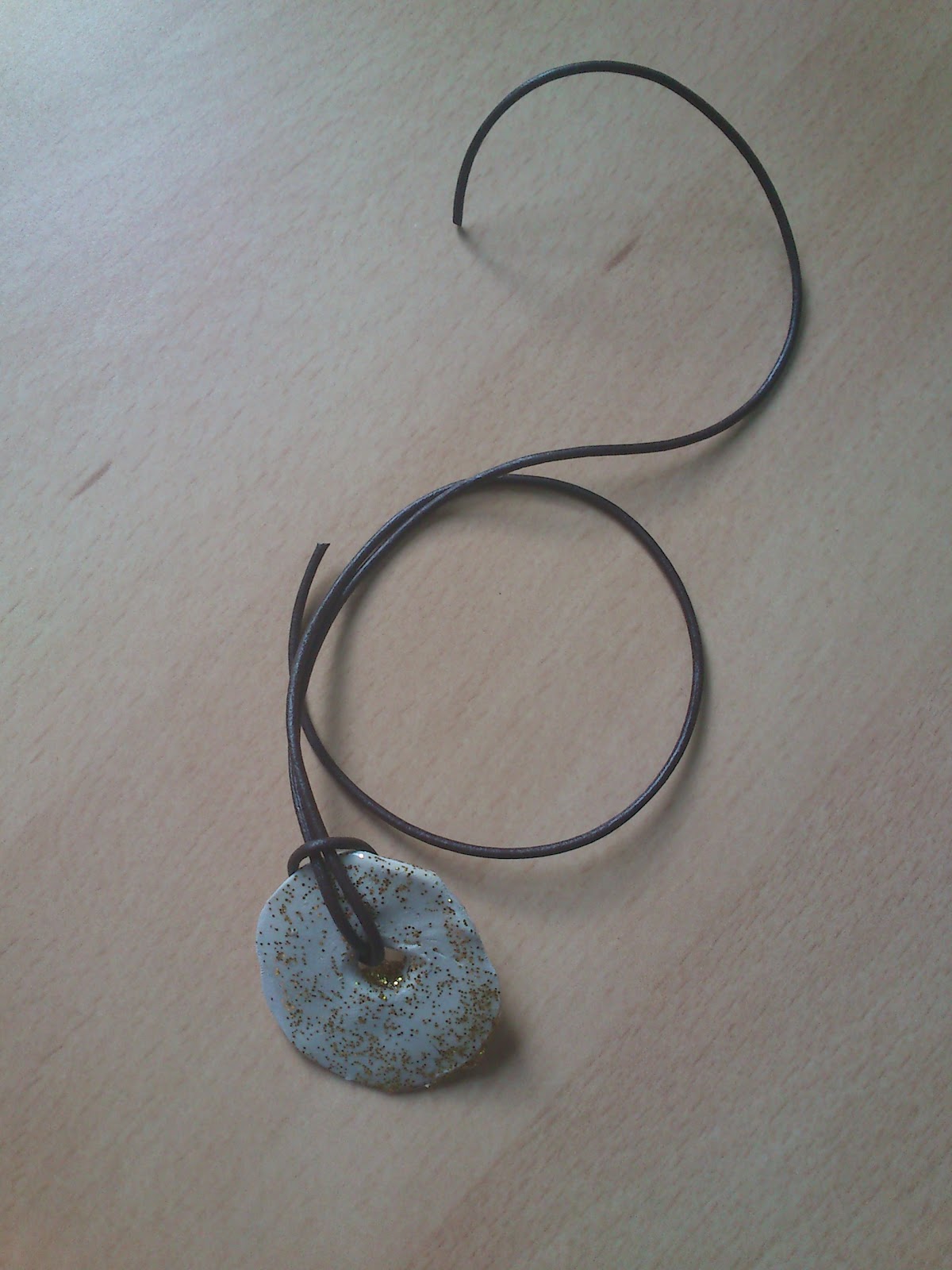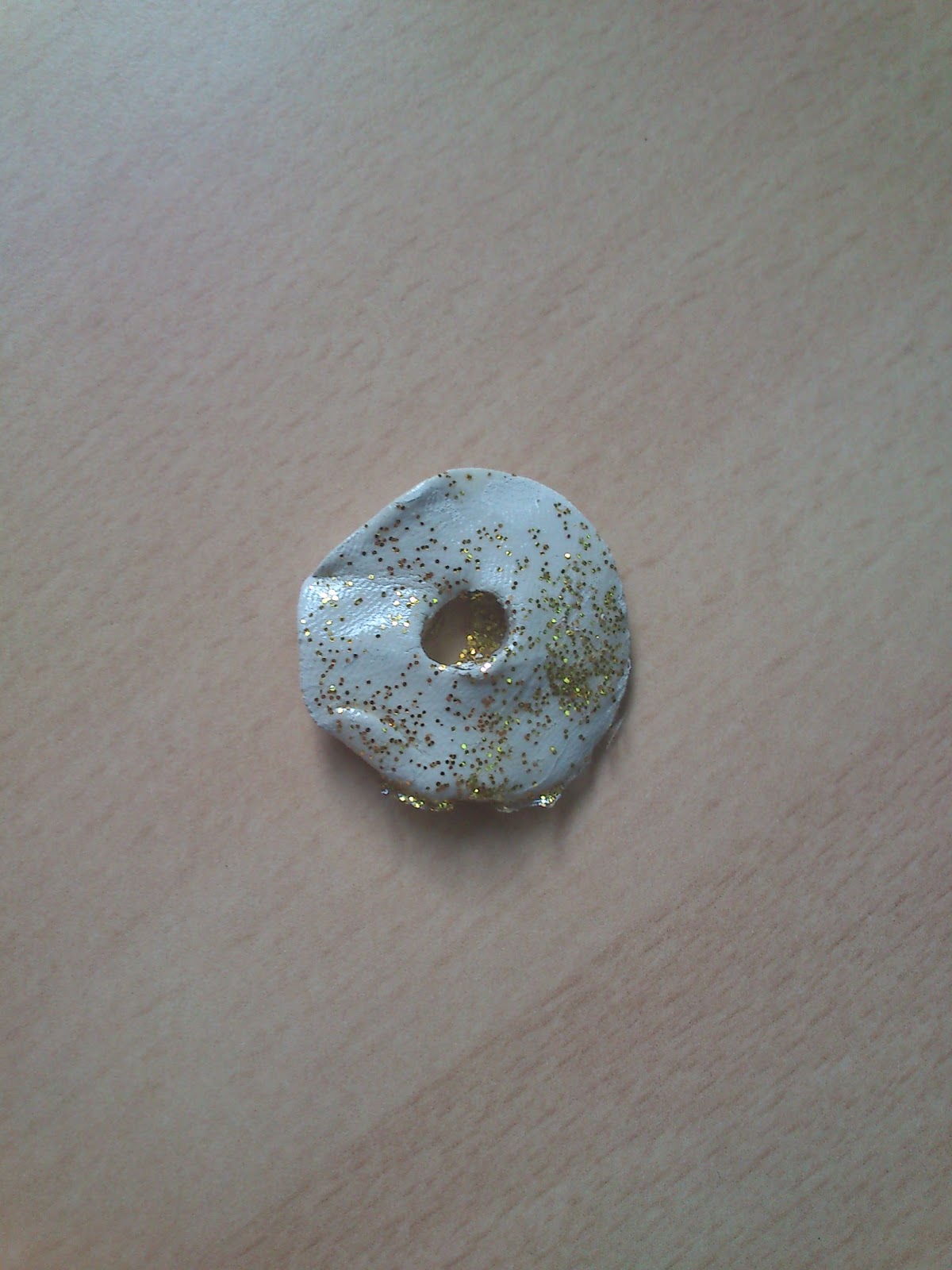 Un cop hem aixafat la boleta li fem un forat al mig (passant-li un boli, per exemple), esperarem a que s’assequi. I quan ja estigui seca, la vernissem amb purpurina: