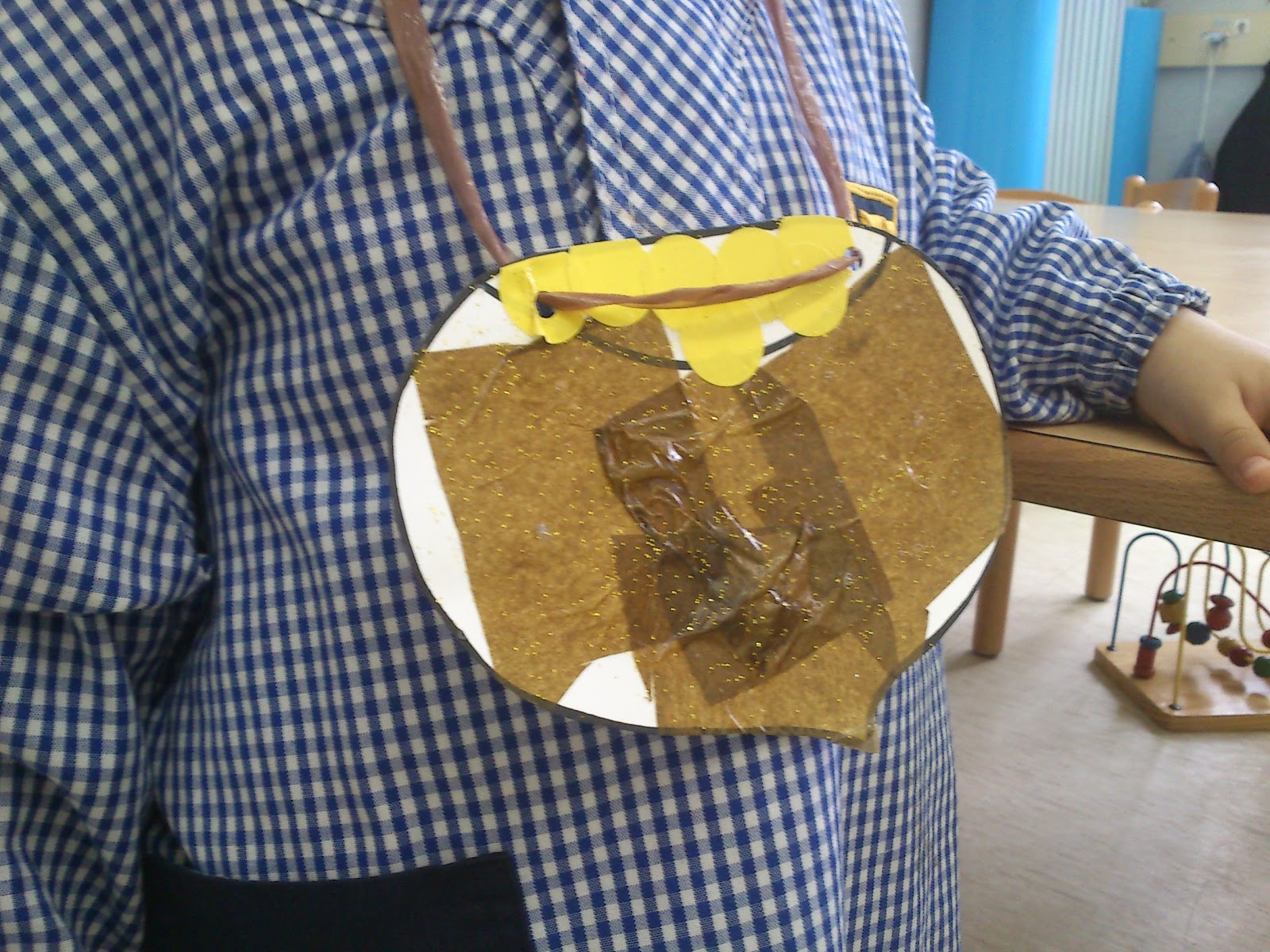 I per acabar, fem dos forats i passem la ràfia o el cordill per tal que els nens/es la puguin dur penjada del coll!!