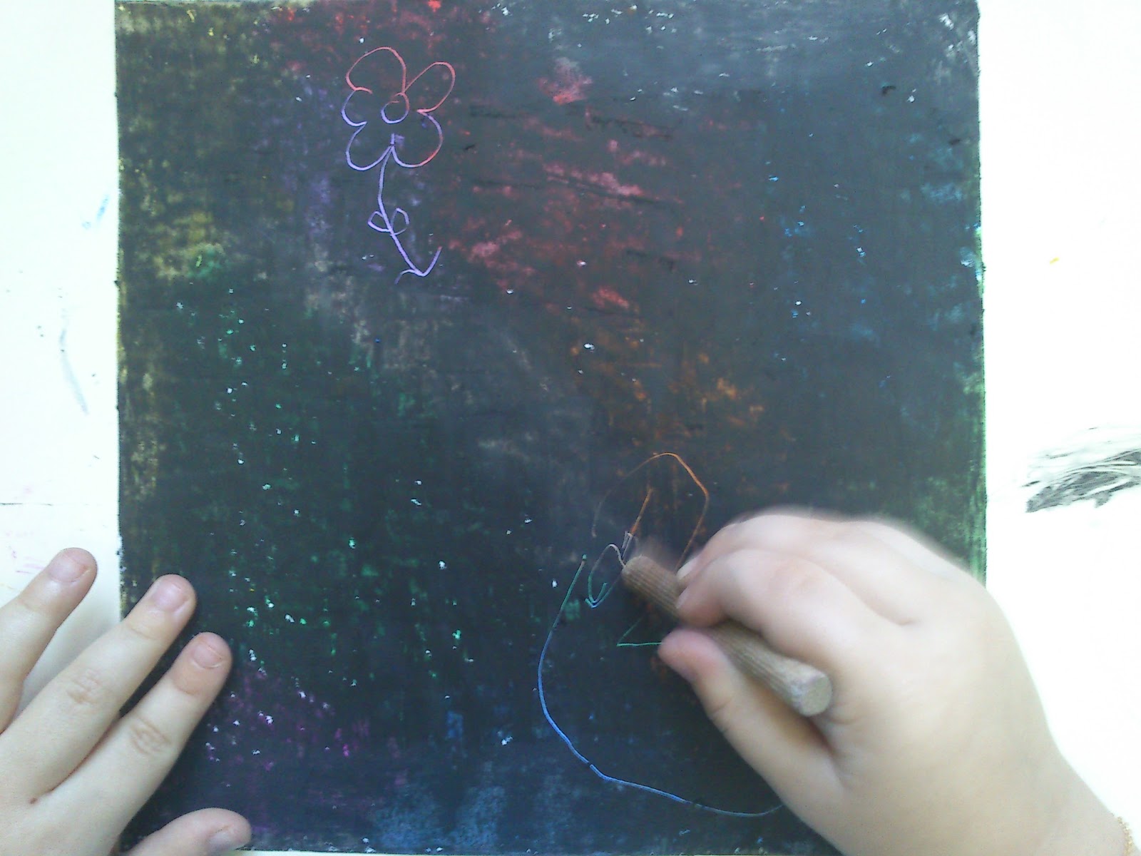 Un cop tot ben negre, agafem el punxó o l’escuradents i hi dibuixem el que volguem. Màgia! El traç va canviant de color!