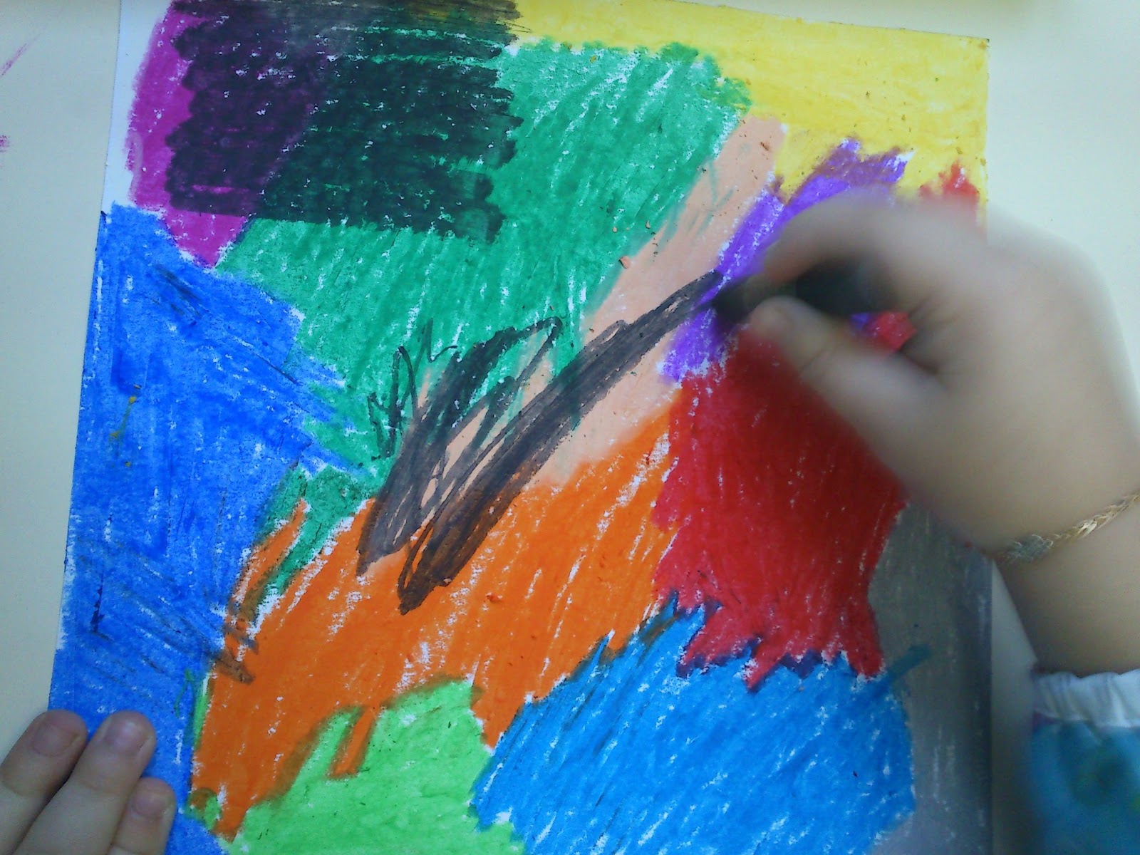 Un cop tenim tota la cartolina plena de colors, pintem amb cera negra per damunt de tota la superfície: