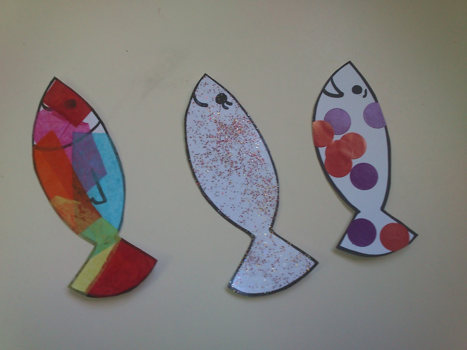 Els nens/es fan cada peix de manera diferent. A un li enganxen papers de seda de colors (i després el vernissem), a l’altre li enganxen els gomets, i a l’últim fem una barreja de vernís i purpurina i el pinten amb això. Quedaran així: