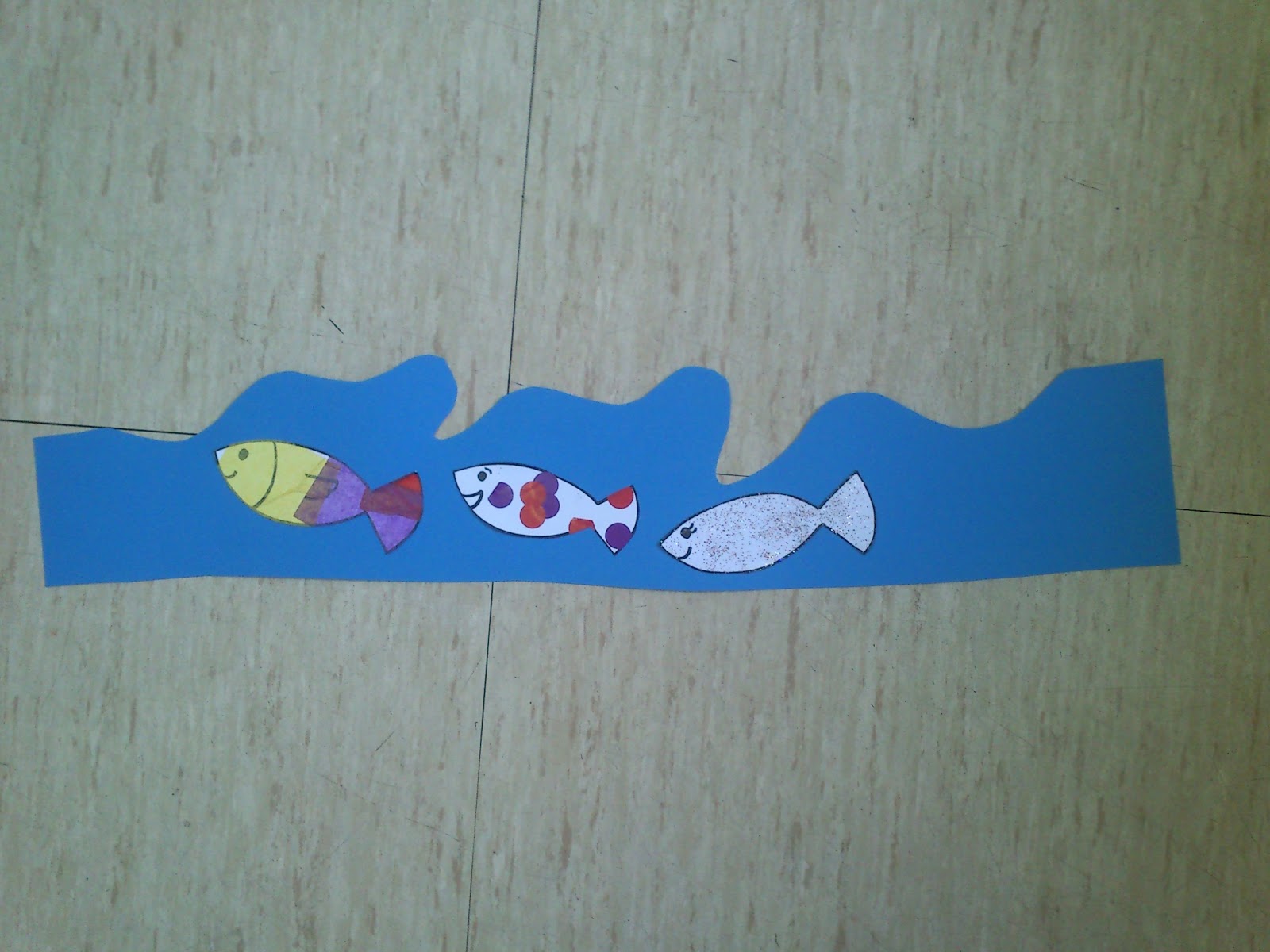 Després agafem la cartolina blava, i la retallem per fer una corona, però enlloc de fer-ho recte o amb punxes com de costum, fem onades, per simular el mar. De manera que una banda ens quedarà recte, i l’altre ben desigual. Retallem els peixos i els enganxem: