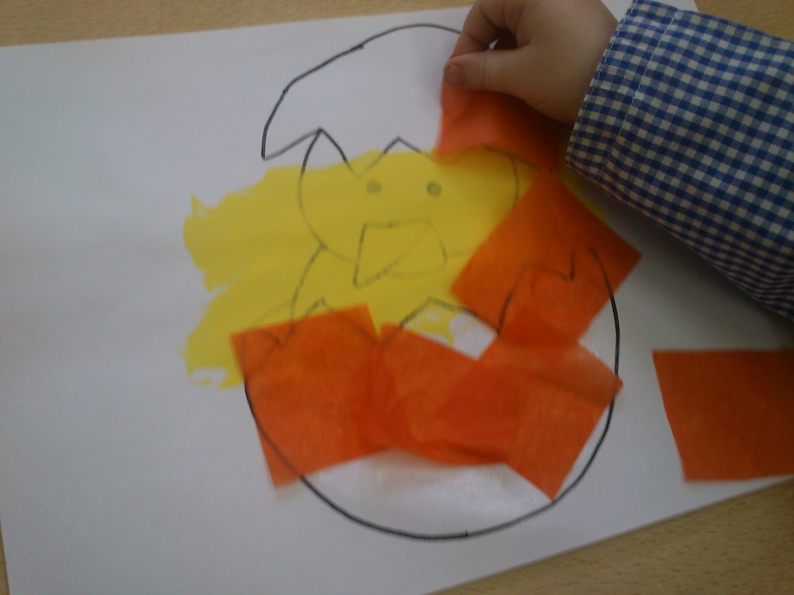 Un cop sec, posem pega per tota la superfície de la closca i hi enganxen papers de seda de color taronja: