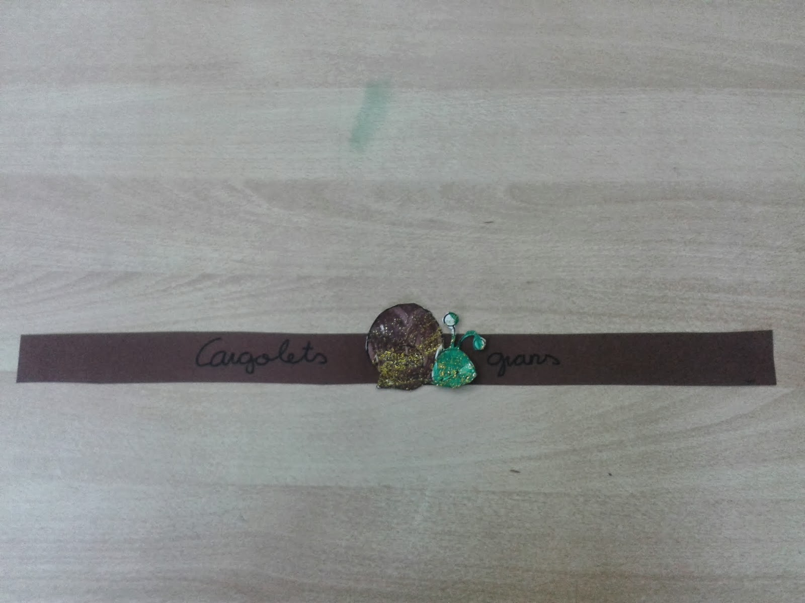 Fem un dibuix d’un cargol, seguidament els nens i nenes amb pintura verda en pinten el cap i amb pintura marró la closca. Deixem que s’assequi. Per altra banda, retallem la cartolina (en fem una tira una mica gruixuda) que farà de corona. Enganxem el cargol al mig i prenem la mida del cap del nen/a i ho grapem.