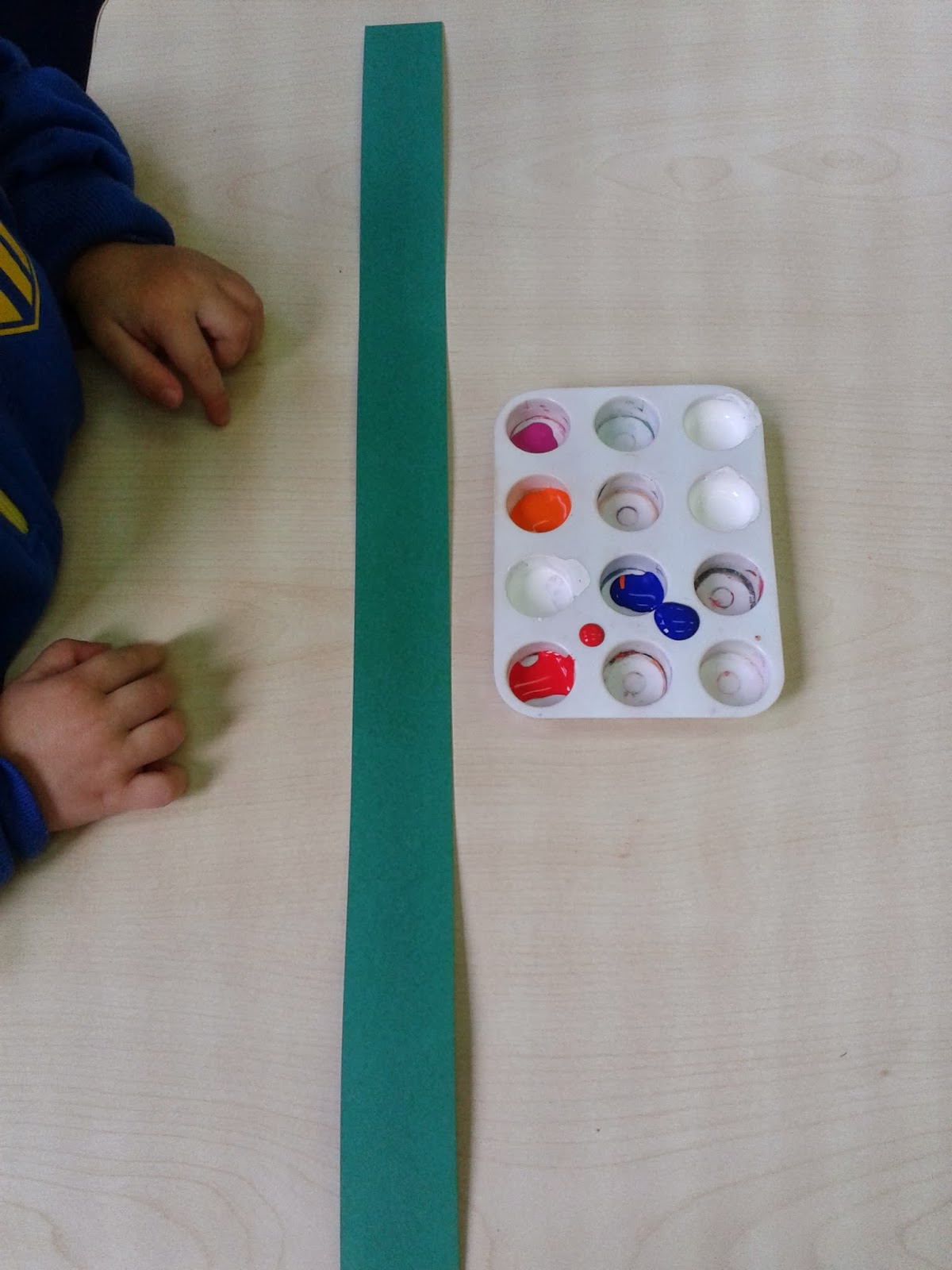 De la cartolina verda en tallem una tira, d’uns tres centímetres d’ample, més o menys. I preparem les pintures: