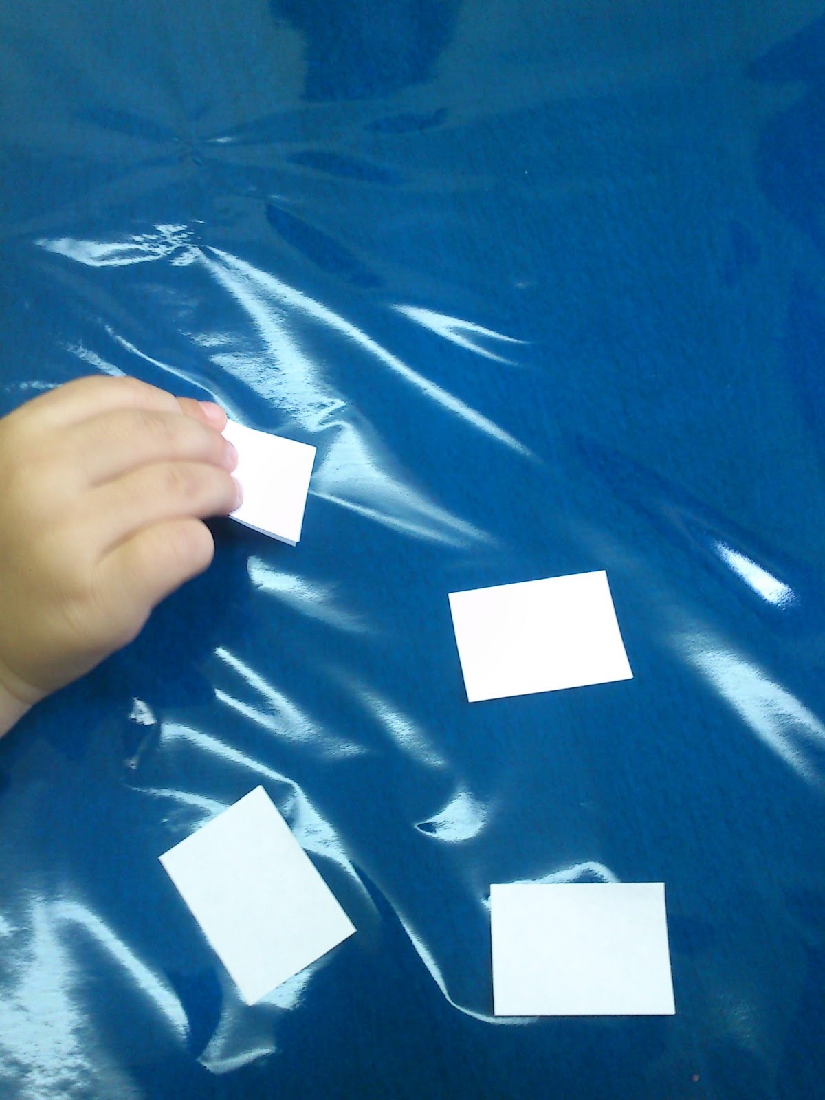 Agafem el paper de celofana de color blau i el posem damunt de la taula o al terra. Els nens/es hi enganxen les enganxines blanques simulant, així, la neu: