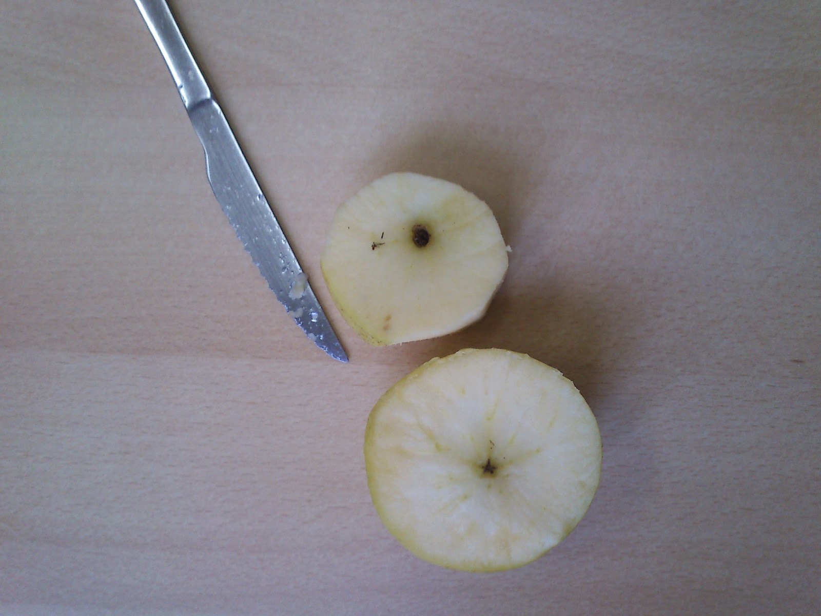 Agafem (en aquest cas) la poma i, amb el ganivet, la tallem per la meitat. Amb una de les dues parts, intentem aconseguir una forma una mica ovalada. I amb l’altra part una rodona una mica més petita. Seran el cos i la cara del ninot de neu.
