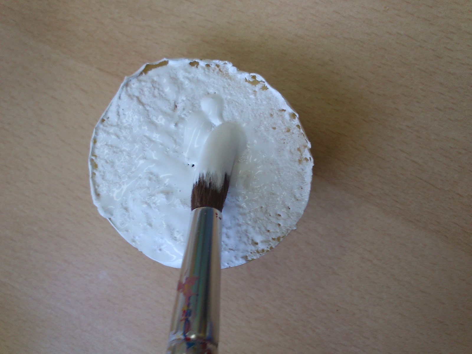 Un cop tinguem feta la forma que desitgem, agafem la pintura blanca i l’escampem amb un pinzell per una de les cares del que seria el cos del ninot. Després fem el mateix amb l’altre tros de poma.