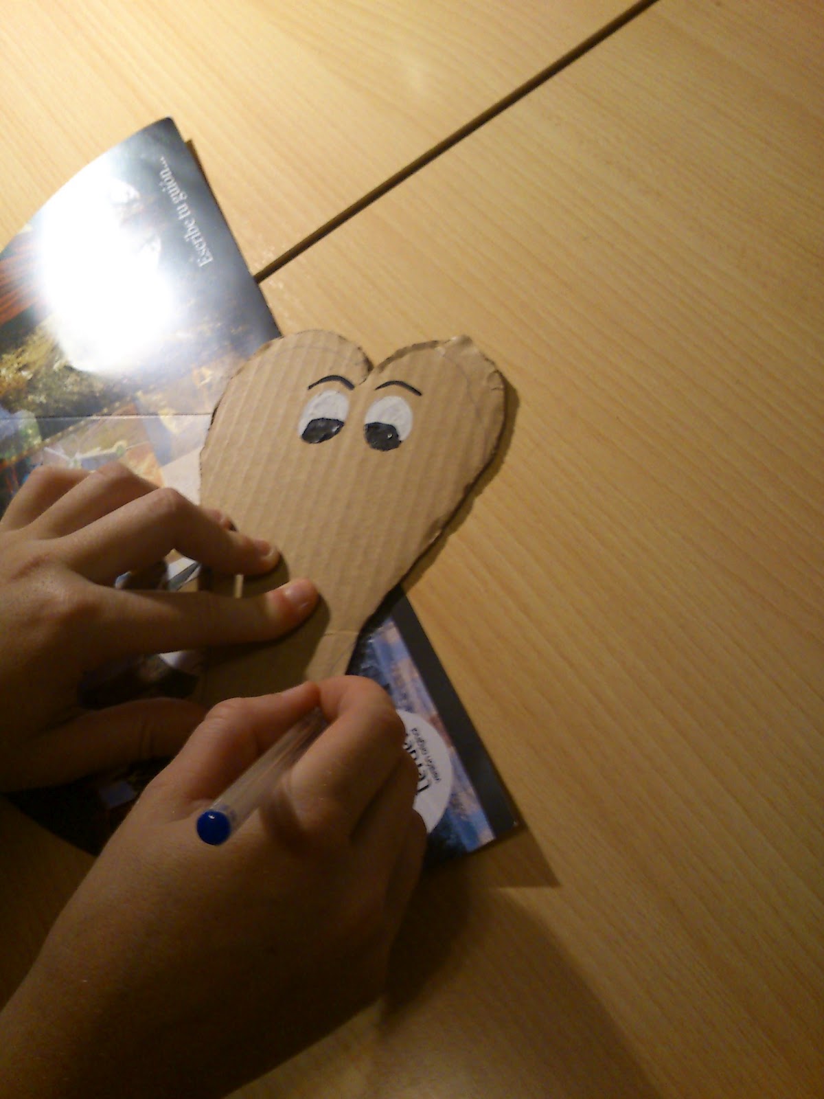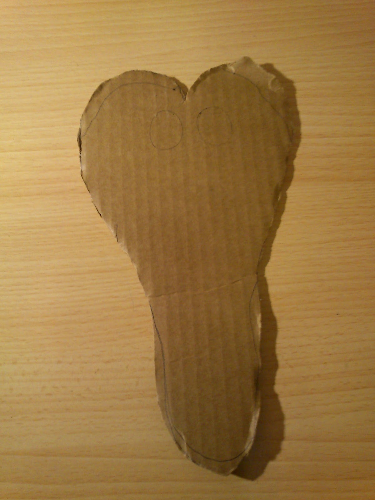 Mentre deixem que els ulls s’assequin, ens centrem amb l’altra part. Agafem la cartolina (o el material semblant) que haguem trobat. Posem la part que ja hem fet al damunt i resseguim més o menys la meitat de la figura, fins per sota dels ulls: