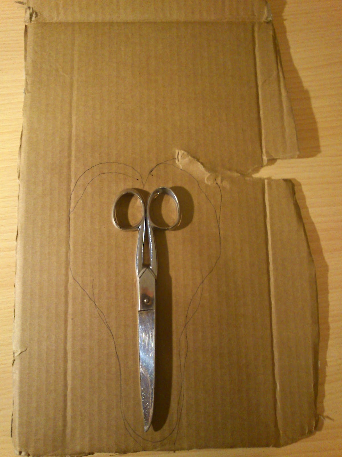 Agafem les tisores a les quals li farem la funda. Girem el tros de cartró (que quedi per la part marró de darrere) i hi posem les tisores a damunt per, amb un llapis, resseguir-les (però no arran) i que quedi la seva forma marcada. El que sí és important, és marcar on aniran els ulls que han de coincidir amb els forats per on les agafem: